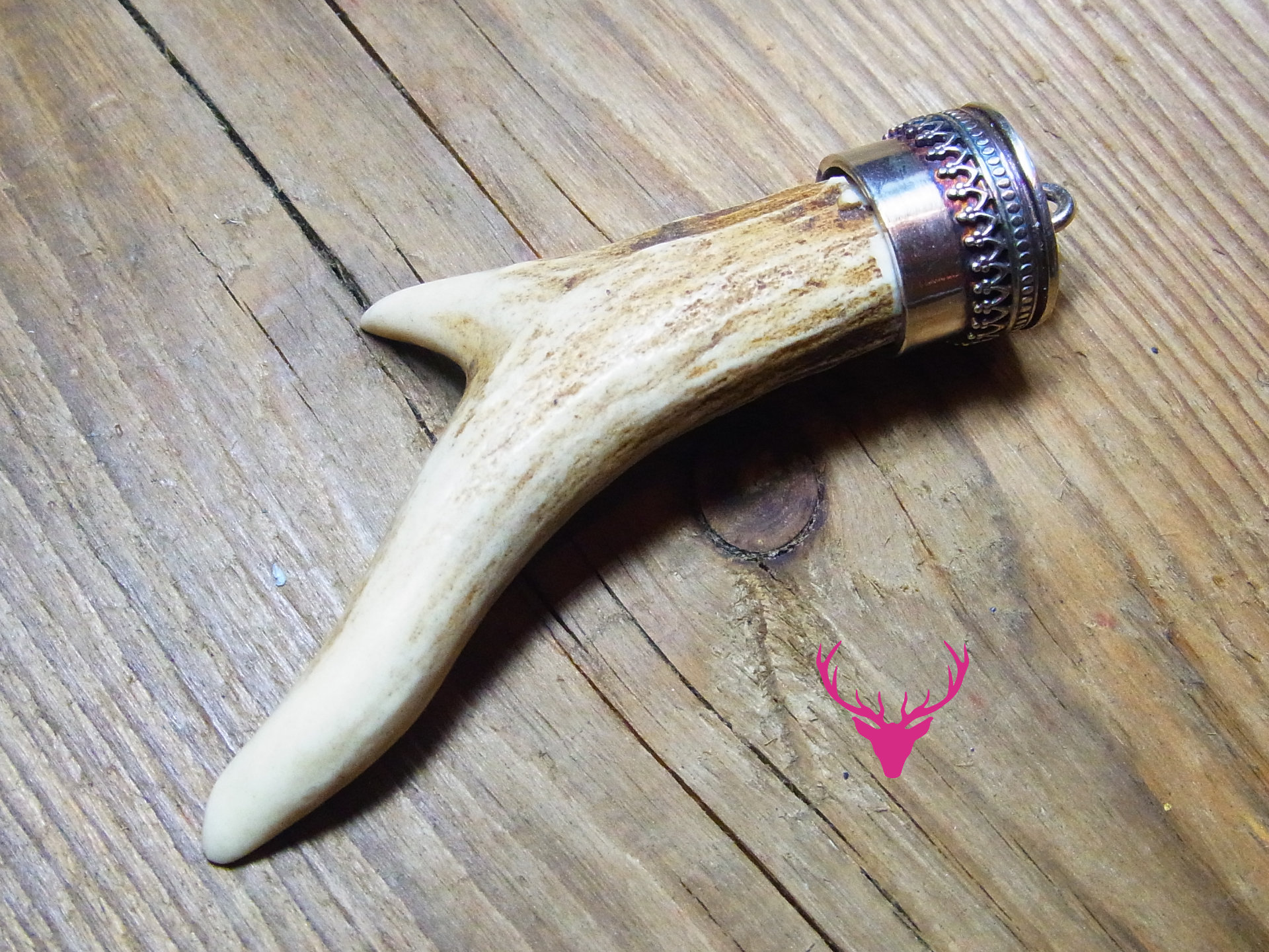 Geweihstange von einem Reh, gefasst in einer aufwändigen Silberfassung als Krone.